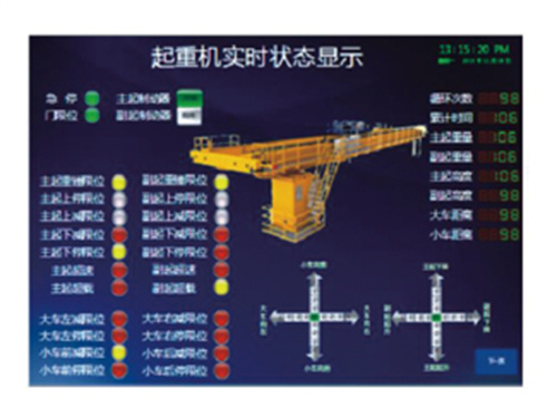 各机构累计运行时间,各机构位置,起吊重量,各机构运行速度,各电机的电压、运行方向,各机构制动器运行状态,故障状态,软硬件安全连锁,动作连锁,主要接触器、检测元件、限位开关状态等;将所有传感器监控到的参数信息传输到各有关部门的监控管理平台,采用不同的设备归属单位使用网页登陆方式,并根据登陆用户的权限密码,实现分区域、进行远程监控、设备管理、信息查询和发布等,满足不同监控群体的需求,提高管理监控的效率。